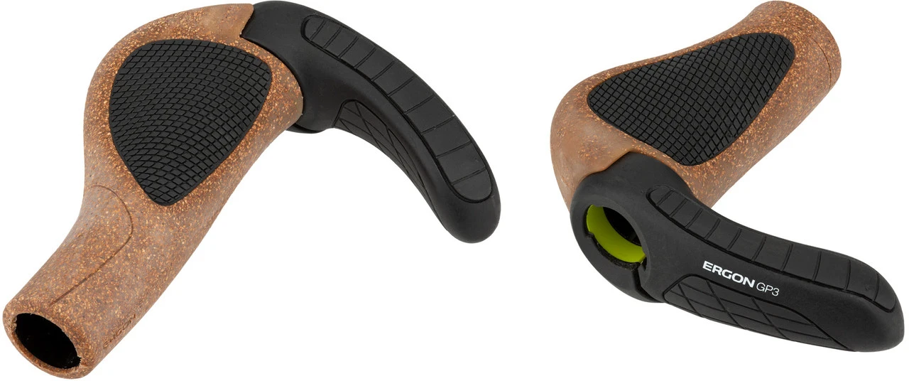 Die GP3 Lenkergriffe aus BioKork von Ergon haben Drei-Finger-Barends und machen Dein Touring-Bike mit einseitigem Drehgriffschalter komfortabler. Der Druck auf den Ulnarnerv wird durch die ergonomisch geformte Handballenauflage verringert. Die Barends erlauben einen Wechsel der Handposition. So vermeidest Du Taubheit und Schmerzen in den Händen und Unterarmen.