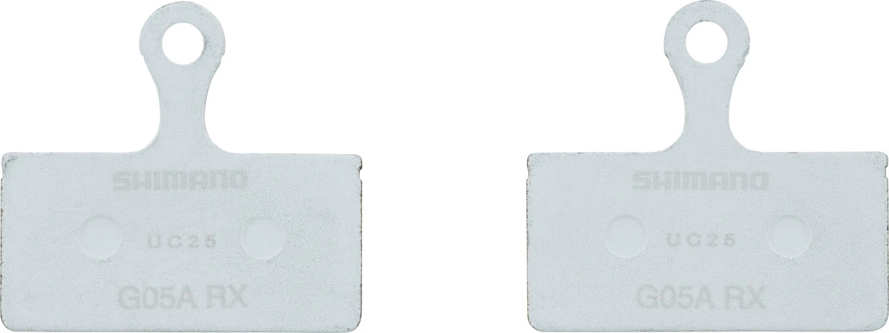 Die Shimano Bremsbeläge G05A-RX haben einen organischen Belag auf einer leichten Aluminium-Trägerplatte ohne Kühlrippen. Sie eignen sich für ältere XTR Bremsen, für XT, SLX, Deore, Alfine und für eine Reihe von gruppenlosen 2-Kolben-Scheibenbremsen. Im Vergleich zum Modell G03A konnte die Lebensdauer um ca. 40 % verlängert werden. Wie üblich für Resin-Beläge sind Geräuscharmut und Dosierbarkeit ausgezeichnet. Die Bremskraft ist überdurchschnittlich – bei optimaler Wärmeisolierung. Damit leisten die G05A-RX sowohl bei Trockenheit wie bei Nässe zuverlässig ihren Dienst.