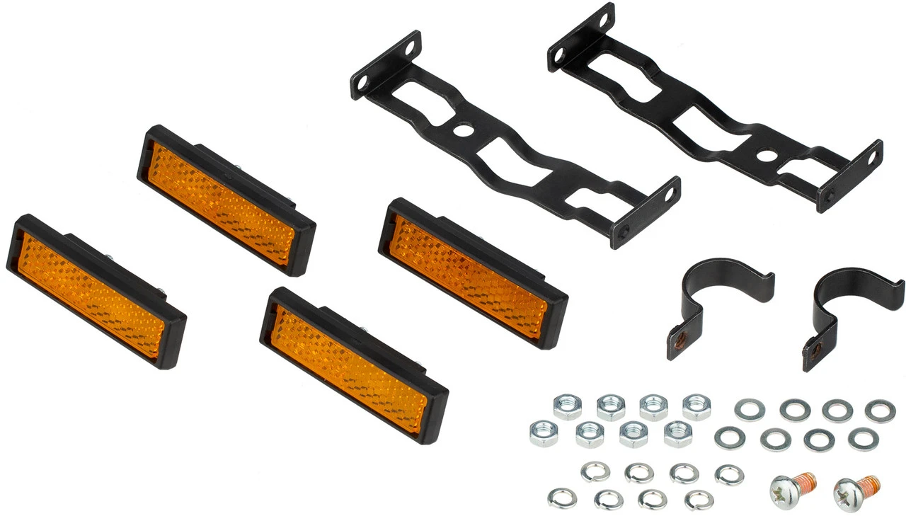 Lieferumfang:4 x Reflektor Shimano SM-PD682 x Montageplatte oben2 x Montageplatte unten2 x Befestigungsschraube für Montageplatte8 x Befestigungsmutter für Reflektor8 x Unterlegscheibe8 x Federring